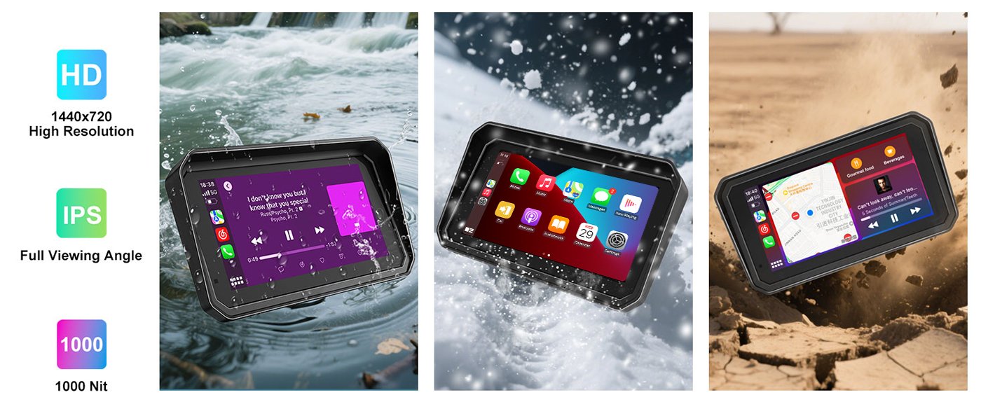 IP68 waterproof QLED motorcycle carplay screen pantalla para moto delivers vivid motorcycle music visuals. Anti-glare improves safety.