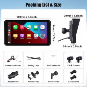 This dash cam for motorcycle carplay unit features a 6-inch IPS screen with 1440×720 resolution, wide viewing angle and high contrast for clear images. Built-in WiFi lets you control the dash cam by app to view, download and take photos, integrating a compact motorcycle camera system and motorcycle gps navigation system gps para motos.