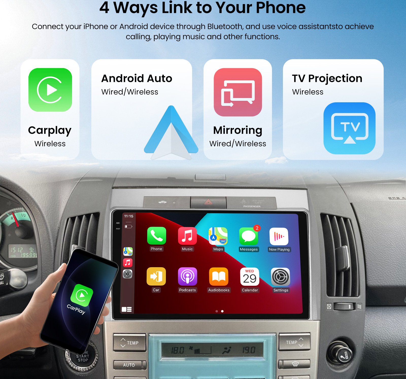 Wired Reliability Option: For longer trips or when fast charging is required, simply connect your phone via USB cable to access CarPlay or Android Auto. The wired connection ensures maximum stability and simultaneously charges your device.