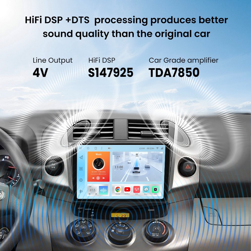 TDA7850 4*50W amplifier chip and optical output make for a superb sound journey,Experience premium in-car sound with an advanced HiFi DSP audio processor combined with a DTS sound enhancement system.