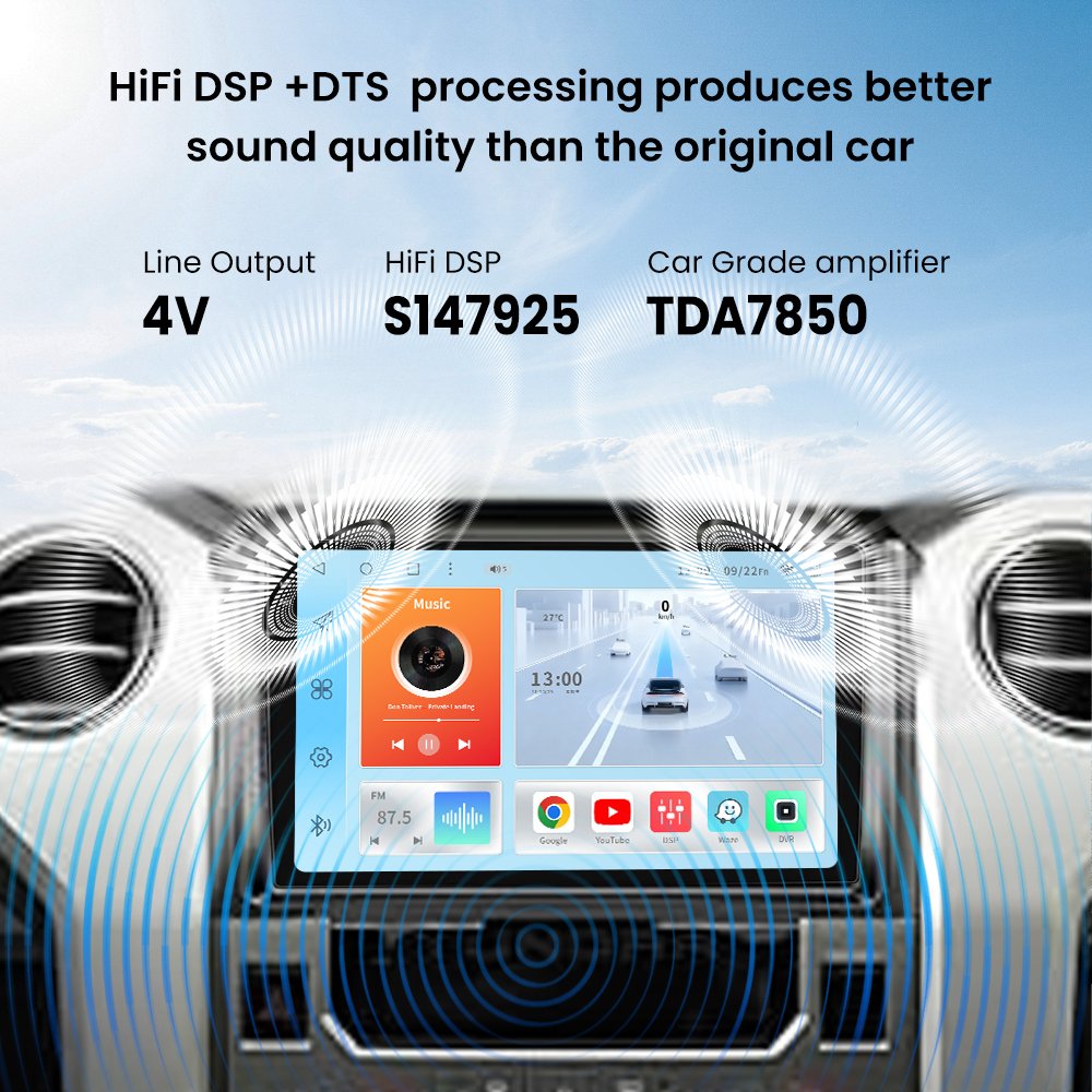TDA7850 4*50W amplifier chip and optical output make for a superb sound journey,Experience premium in-car sound with an advanced HiFi DSP audio processor combined with a DTS sound enhancement system.